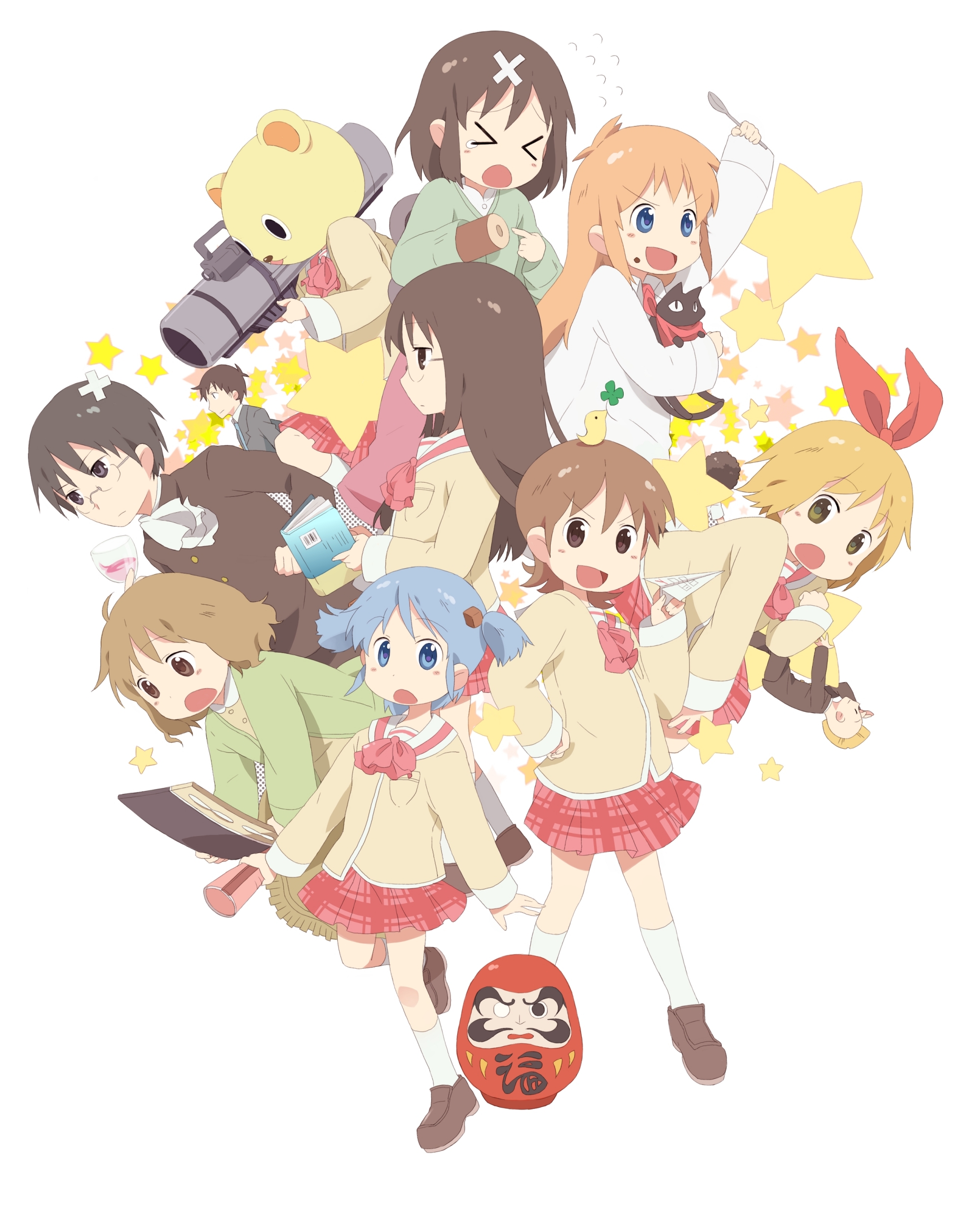 Description: A group of anime girls standing next to each other with stars on them and a teddy bear in the background.