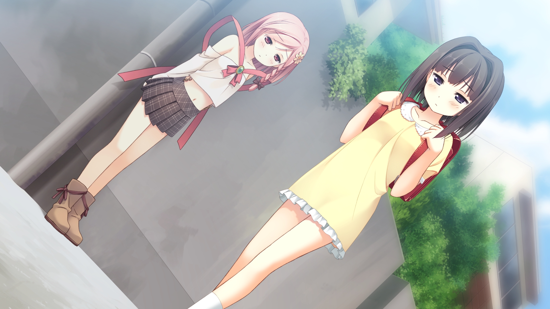 Description: Two anime girls standing next to each other on a street corner.