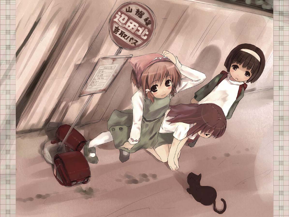 Description: Two anime girls are walking down the street with luggage behind them and a cat on the ground behind them.