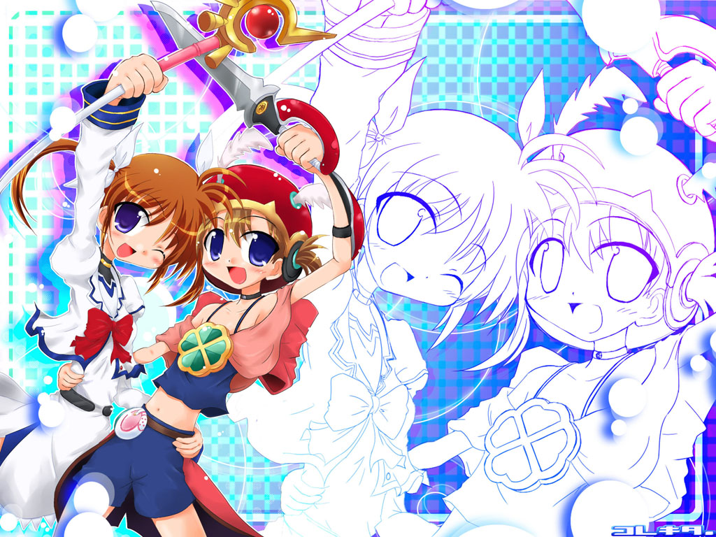 Description: Two anime girls with a sword and a cat on a blue background with white clouds and a blue grid.