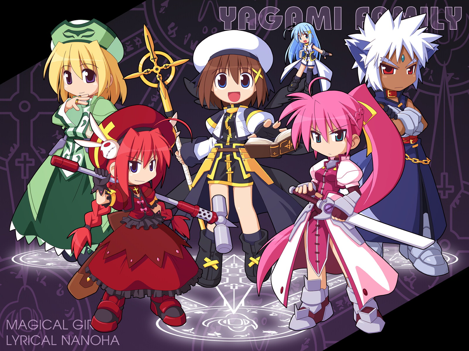 Description: A group of anime characters with swords and armors on a purple background with the words.