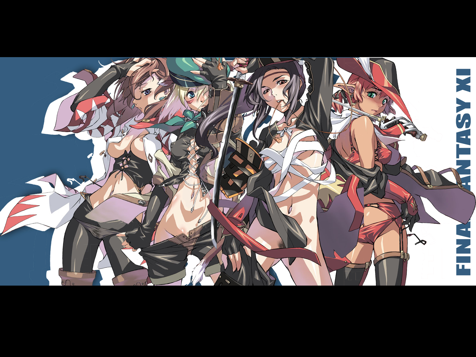 Description: A group of anime characters standing next to each other with swords in their hands and a banner in the background.