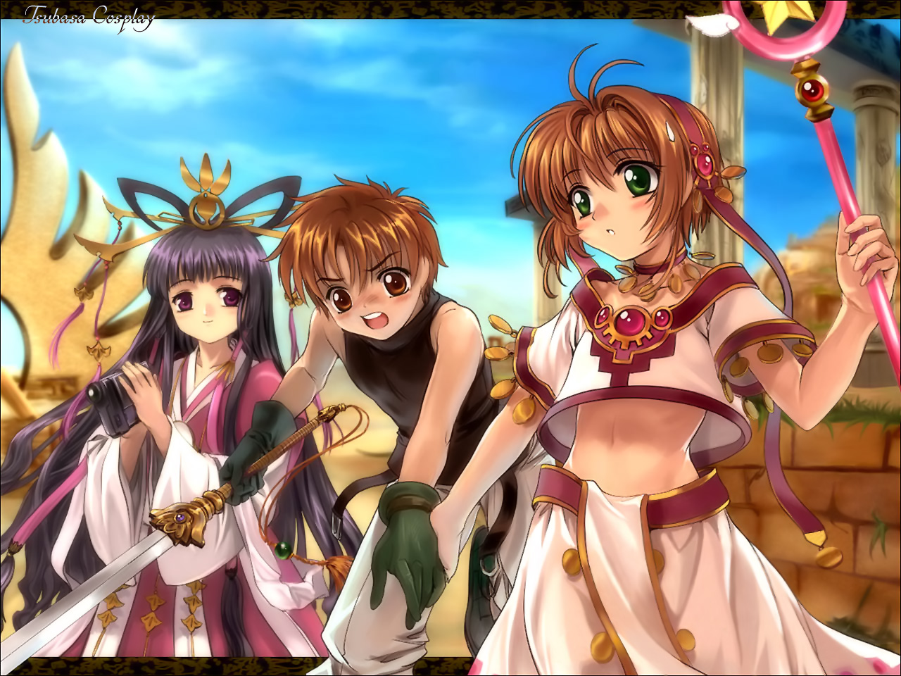 Description: Three anime girls with swords and a sky background with clouds and a castle in the background.