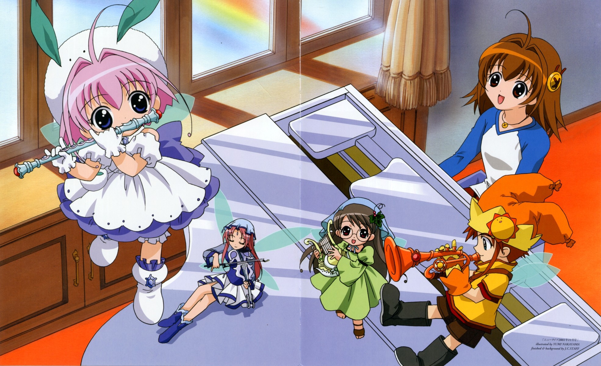 Description: A group of anime girls standing around a table with a rainbow in the background and a rainbow in the background.