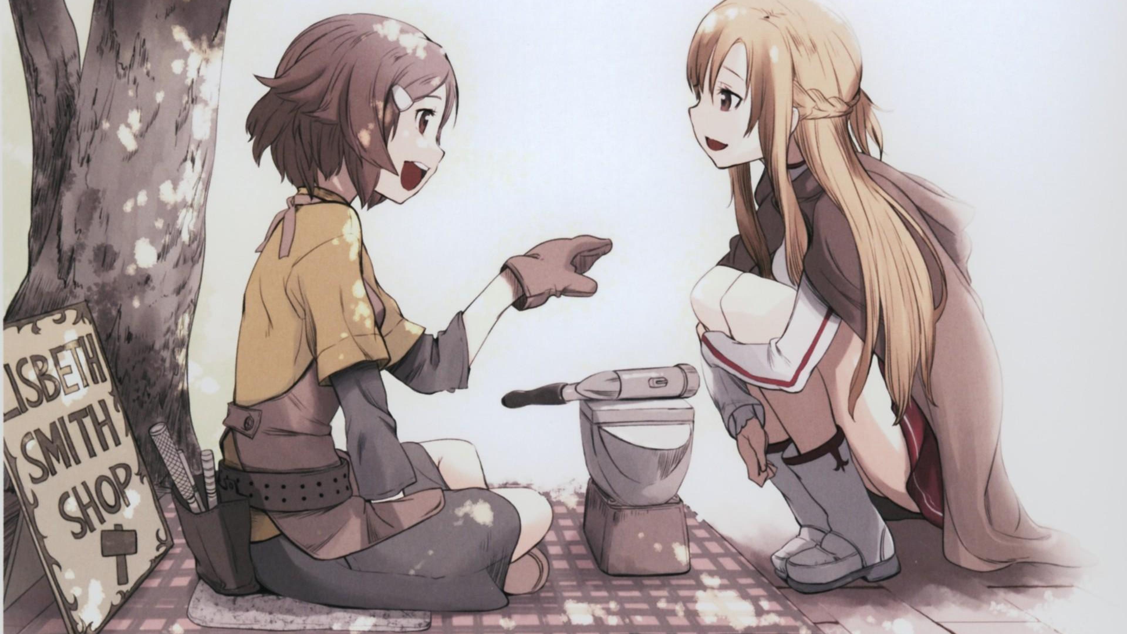 Description: Two anime girls sitting on the ground next to a tree and a sign that says keep with you on it.