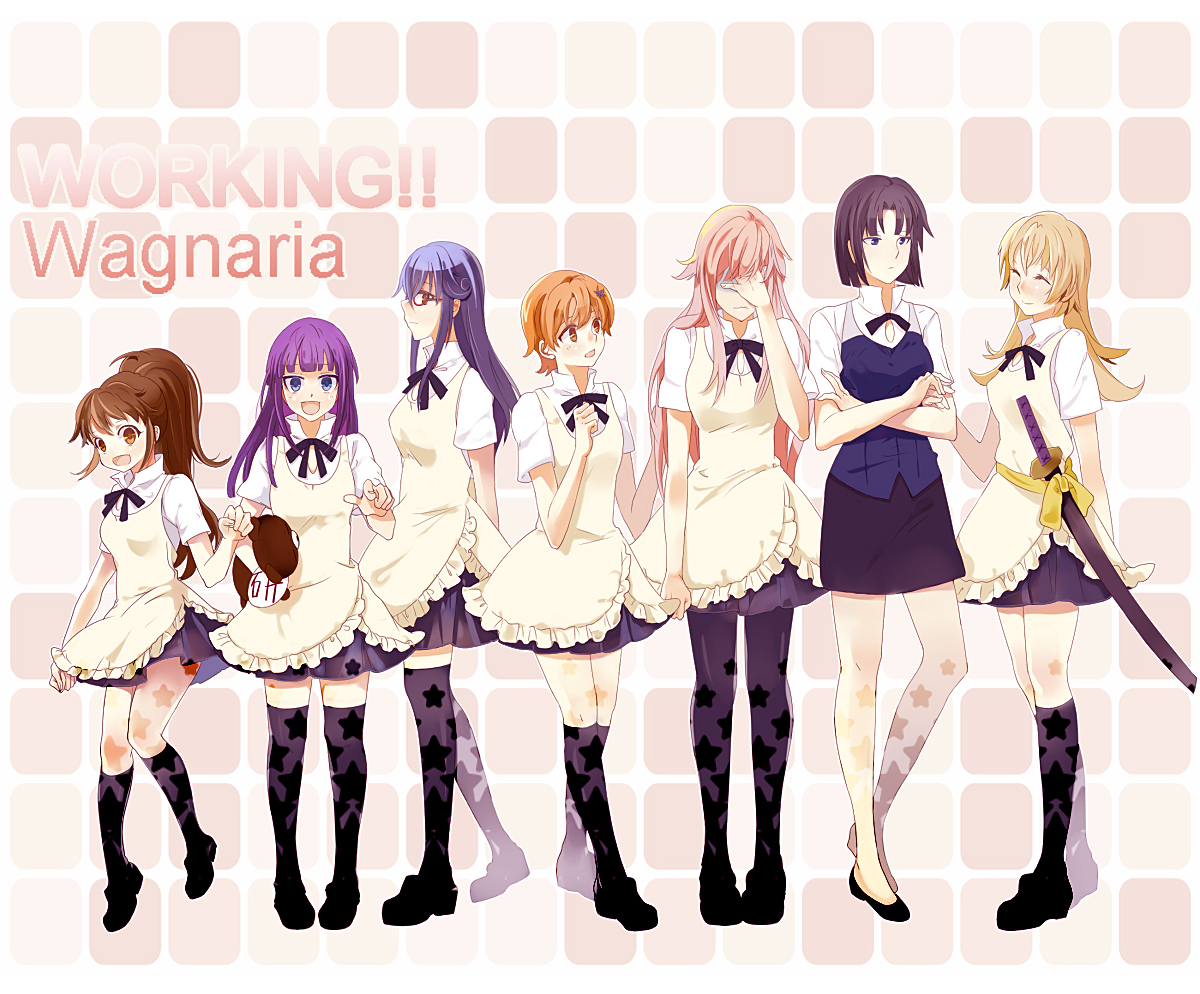 Description: A group of anime girls standing next to each other in front of a wall with words working wagannaria.