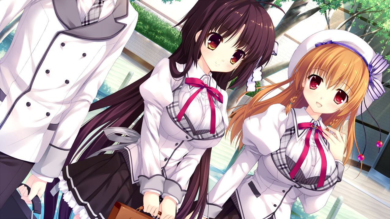 Description: Two anime girls in white outfits and a man in a white suit and tie and a woman in a white dress.