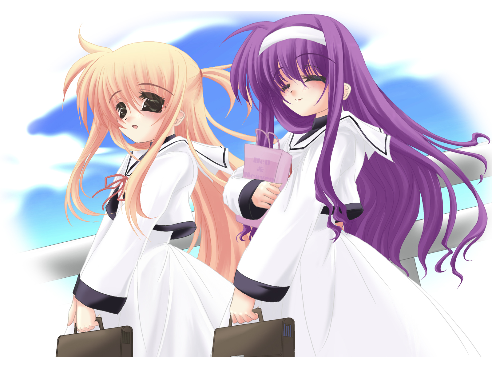 Description: Two anime girls dressed in white and purple hair and holding a book and a suitcase.