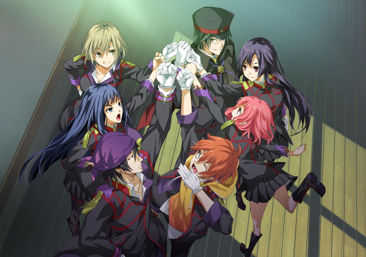 Description: A group of anime girls standing next to each other on a wooden floor in a room with a green light.