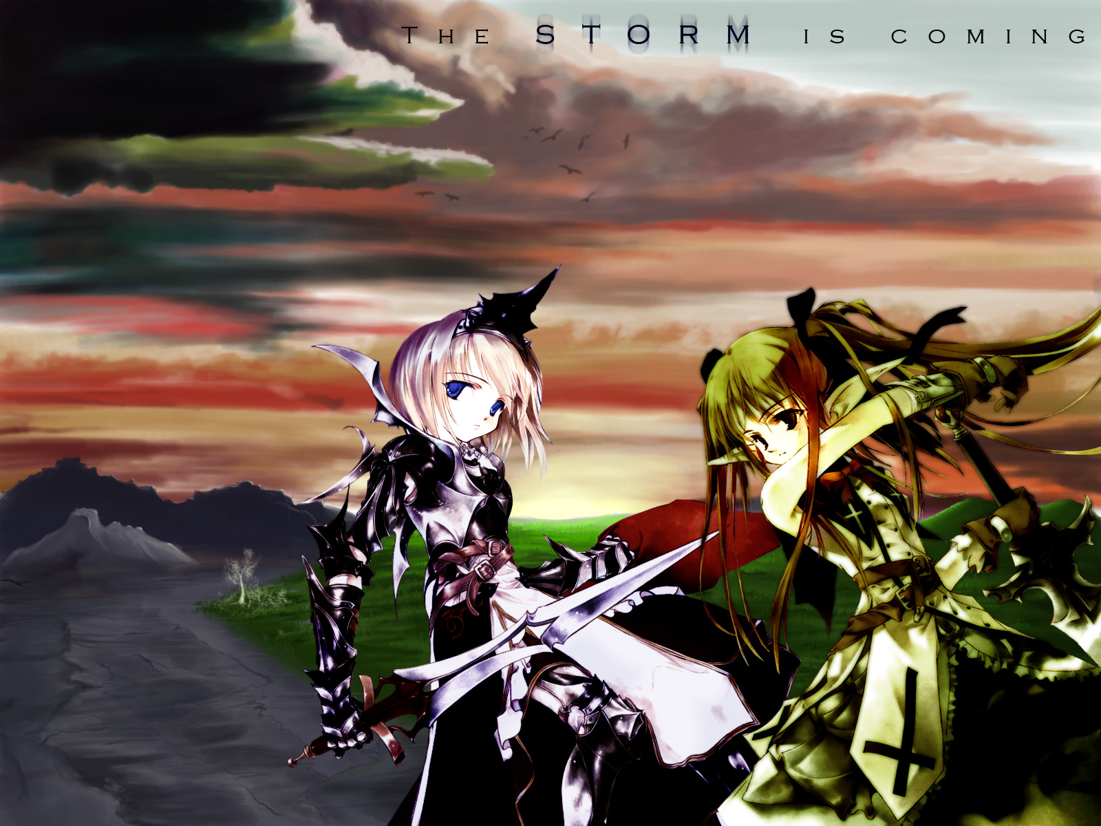 Description: A couple of anime characters standing next to each other on a field with a sunset in the background and a sky with clouds.