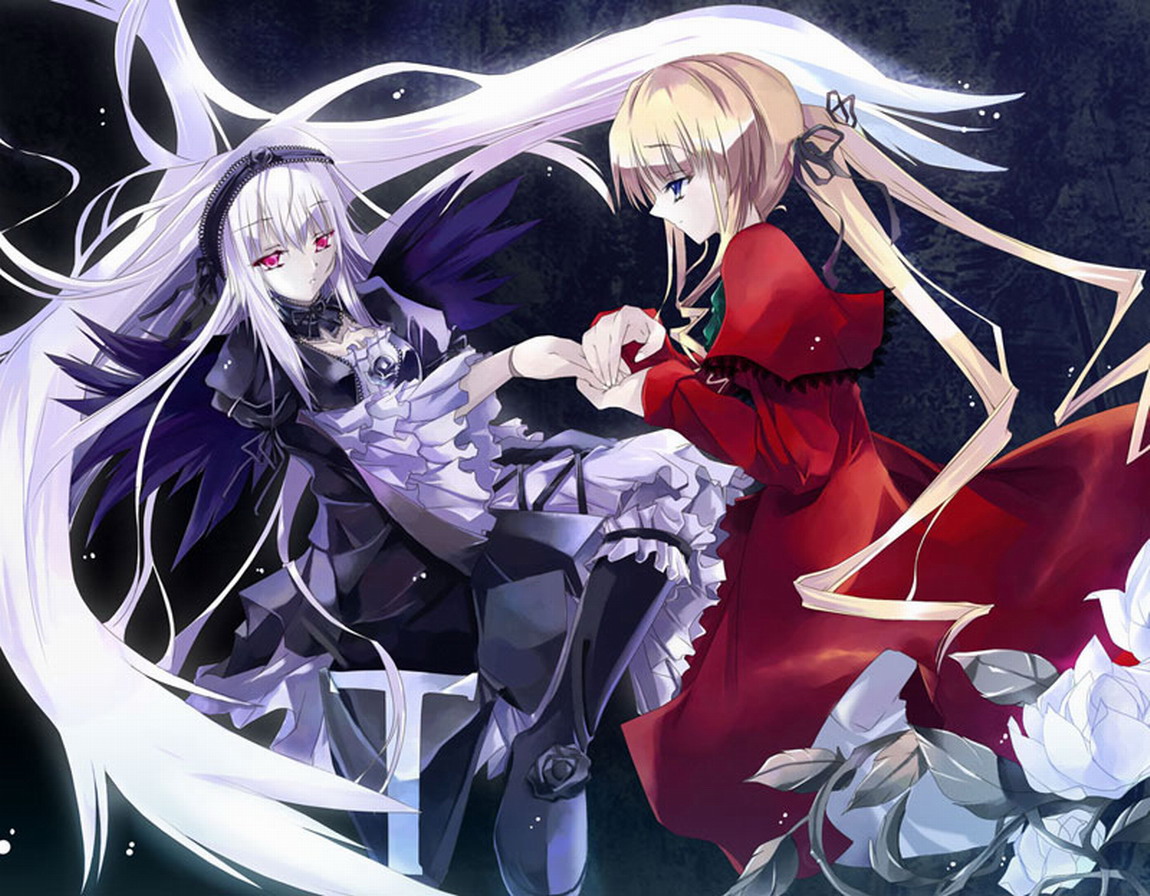 Description: Two anime characters sitting on a bench in front of a dark background with flowers and leaves.