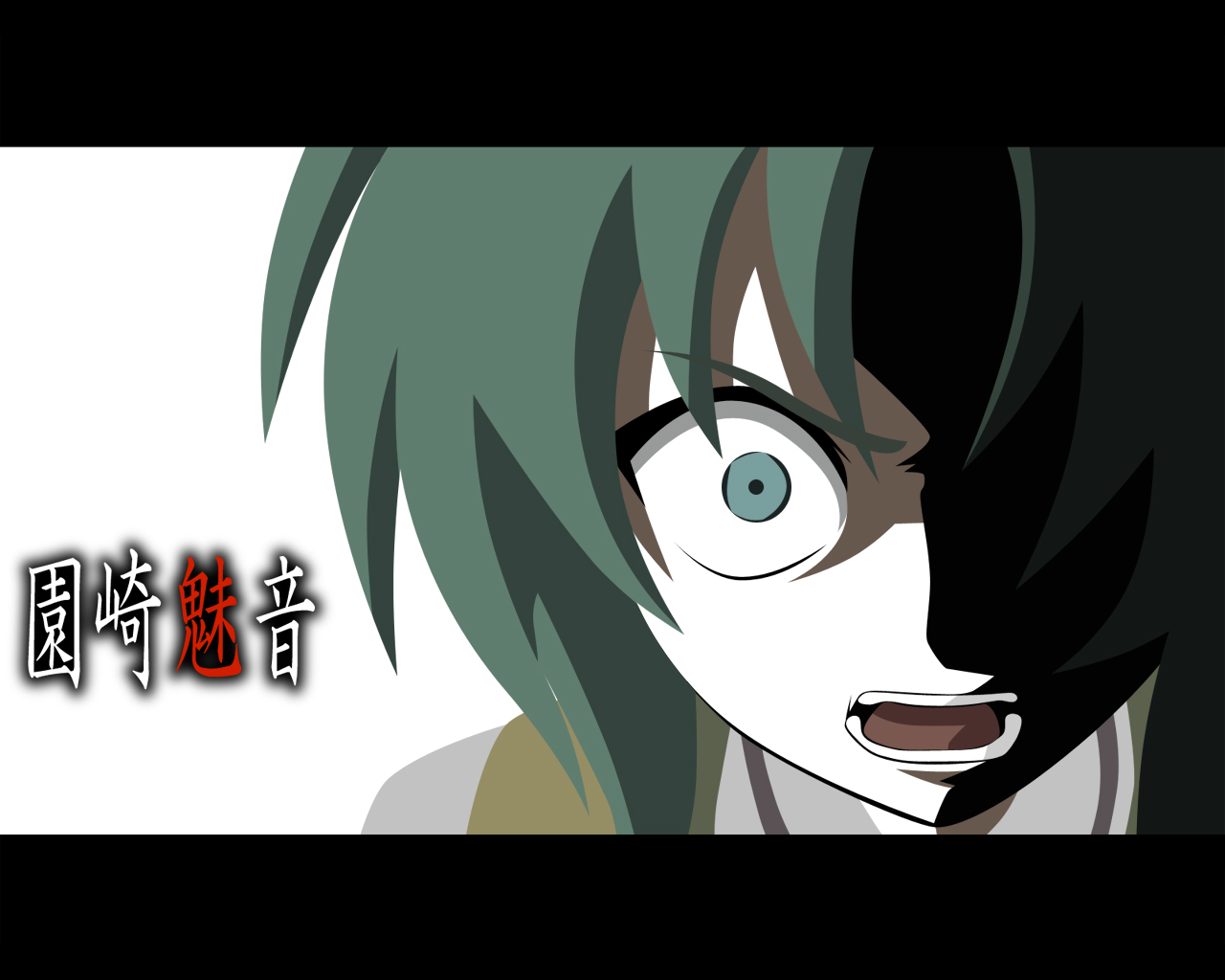 Description: A anime character with green hair and blue eyes with chinese characters in the background and a white background with a black border.