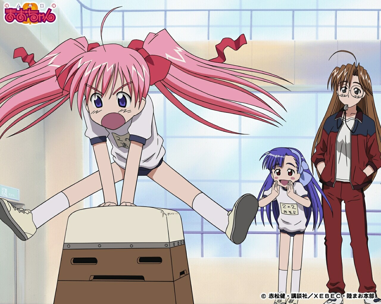 Description: A group of anime characters standing around a box with a girl on it's back and a man on the other side.
