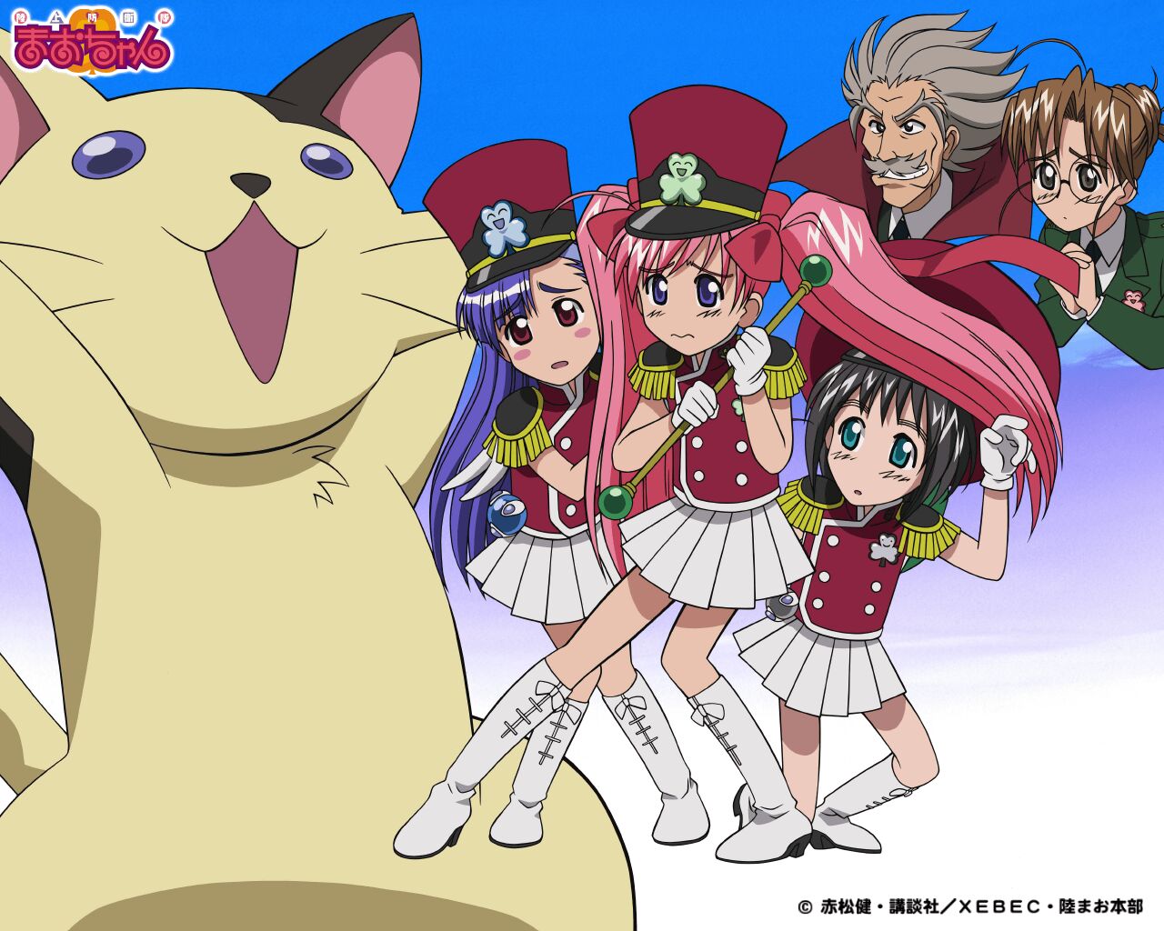 Description: A group of anime characters standing next to a cat and a cat with long hair and a cat's head.