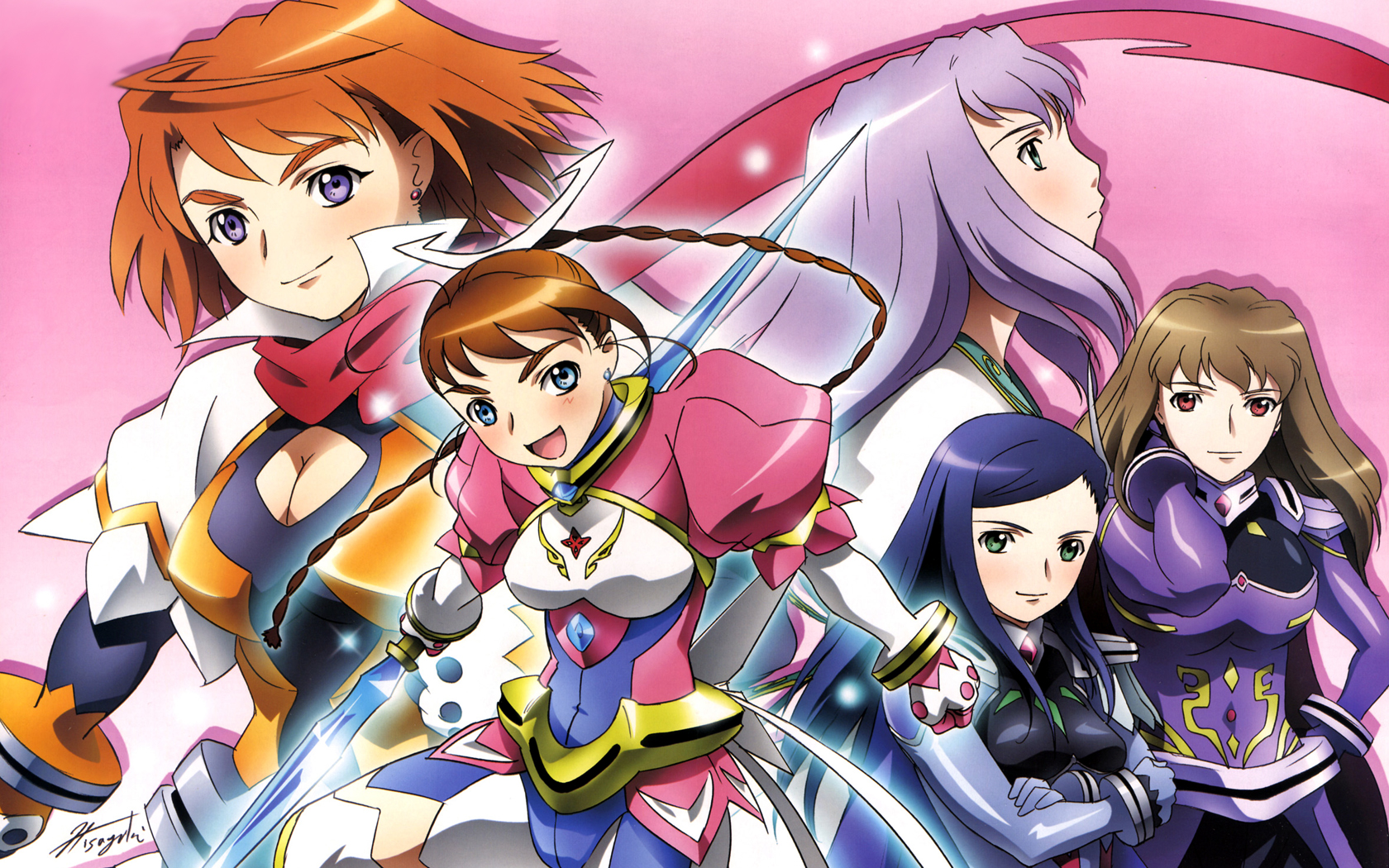 Description: A group of anime characters standing next to each other in front of a pink background with a pink background.