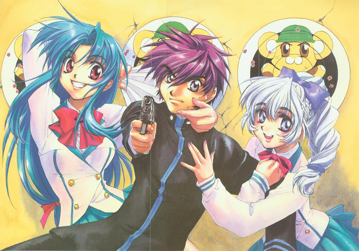 Description: A group of anime characters with guns in their hands and a cat in the background with a yellow background.