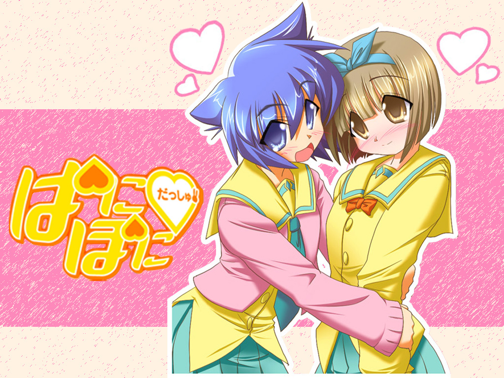 Description: Two anime characters hugging each other with hearts in the background of the picture and the words love is in the upper corner.