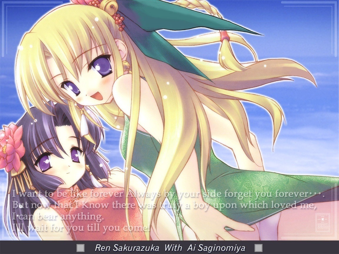 Description: A couple of anime characters hugging each other with a sky background behind them and a caption that reads.