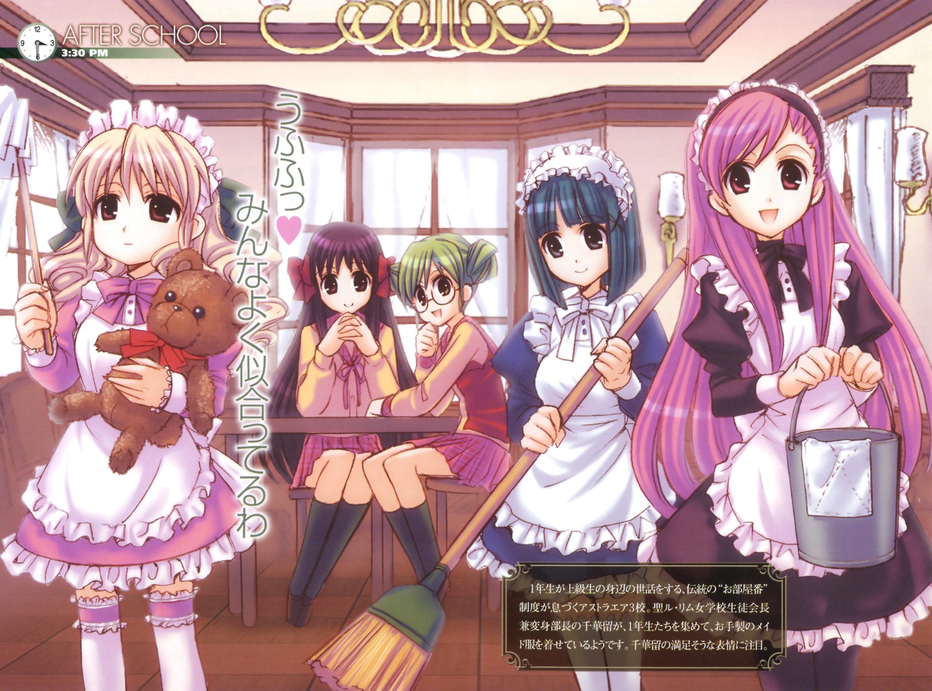Description: A group of anime girls in maid outfits holding a teddy bear and brooms in a room with windows.