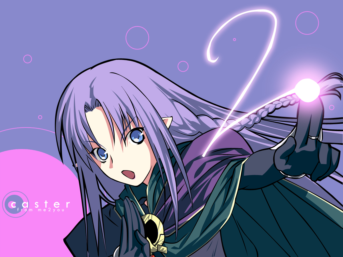 Description: A anime character with a purple hair and blue eyes holding a light saber in her hand and a purple background.