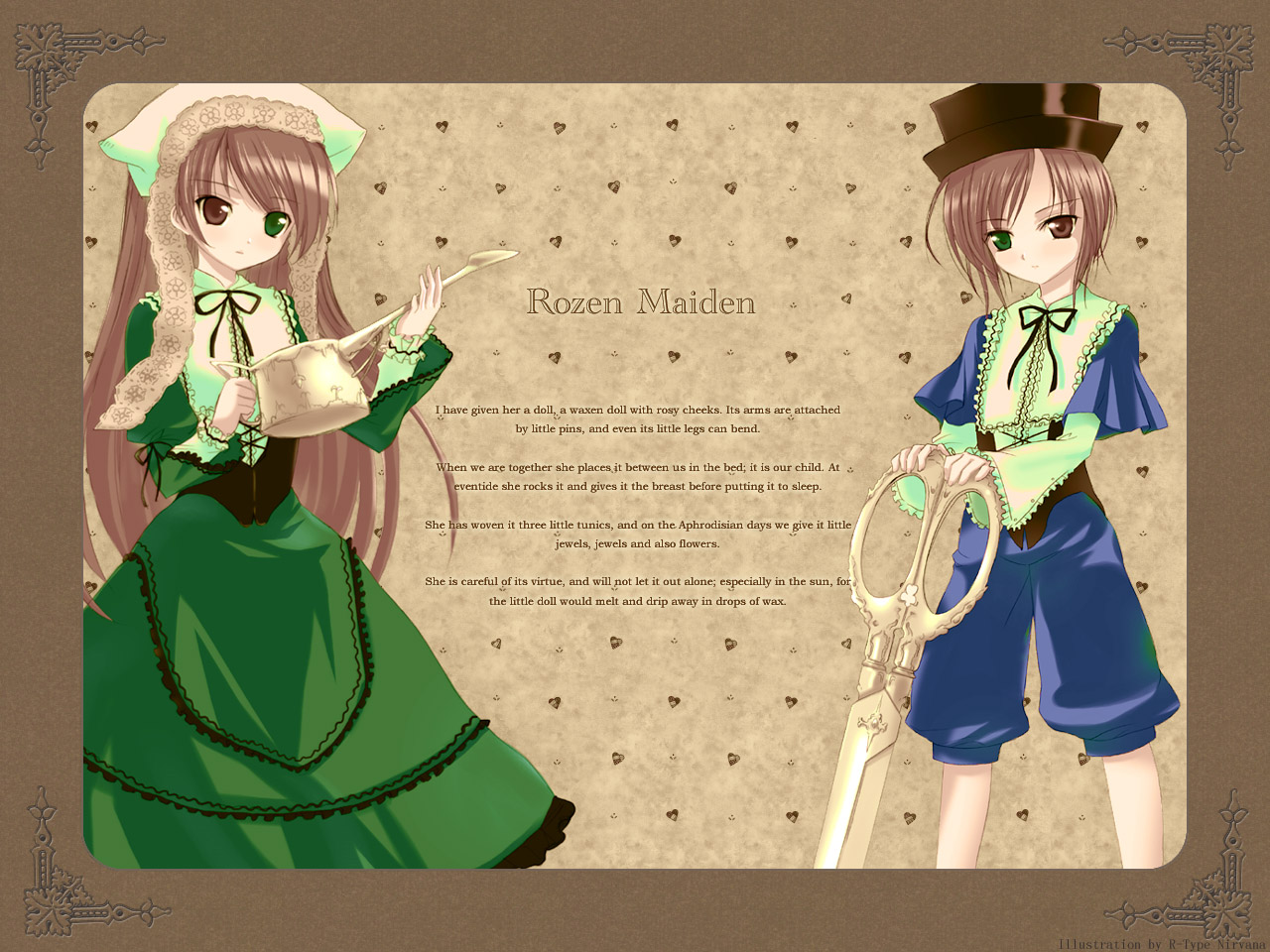 Description: A couple of anime characters standing next to each other in front of a wallpaper with a message written in it.