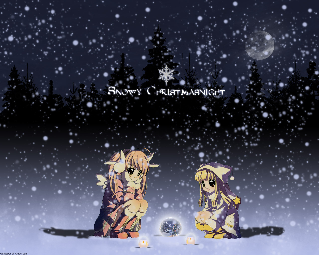 Description: Two anime characters sitting in the snow with a snowman in the background and a full moon in the sky.