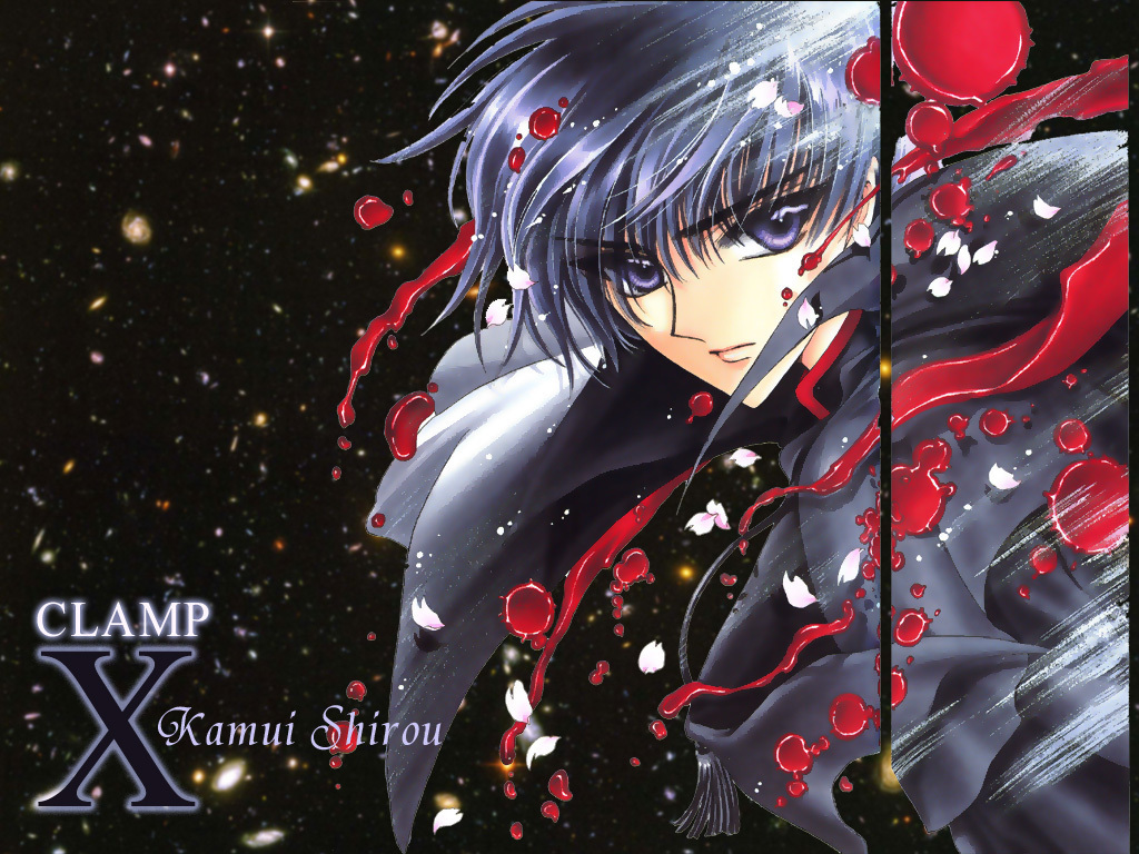 Description: A anime character with a sword in his hand and blood on his face and a black background with stars.