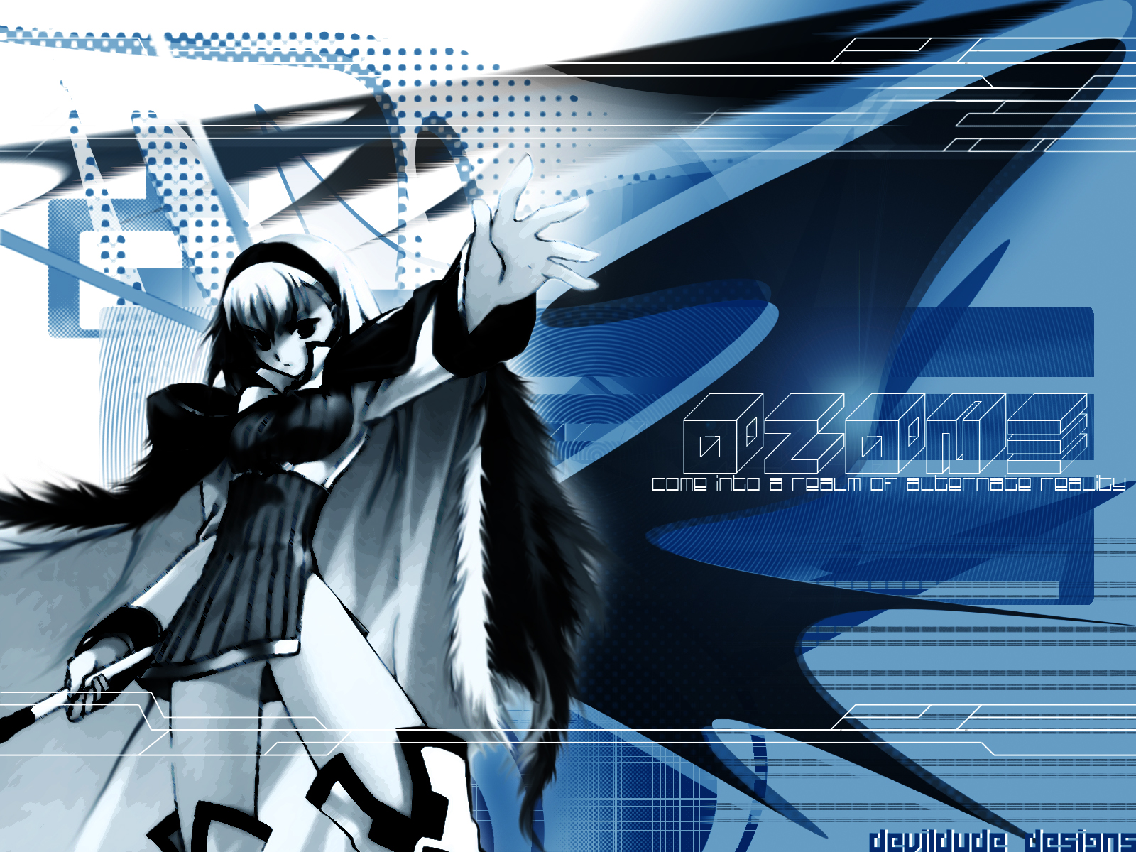 Description: A anime character with a sword and a blue background with a white and black design on it's left side.