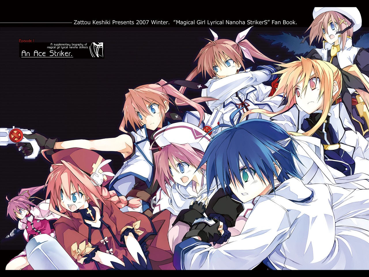 Description: A group of anime characters with swords and hats on their heads.