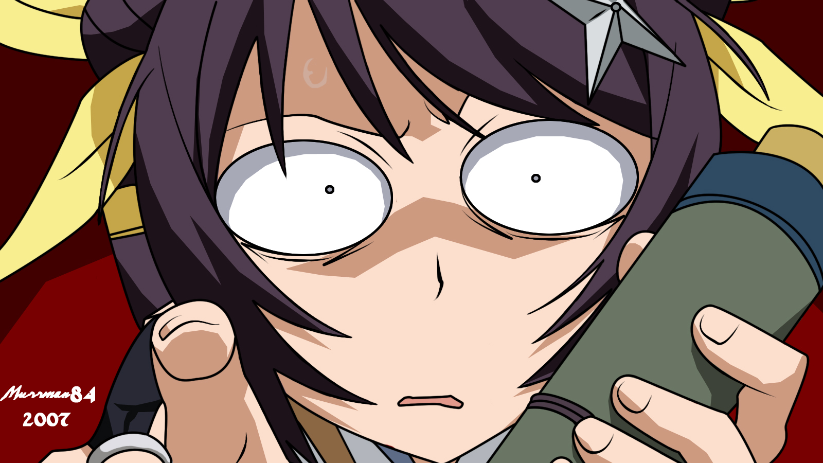 Description: A anime character with big eyes holding a cell phone to his ear and looking at the camera with a serious look on his face.