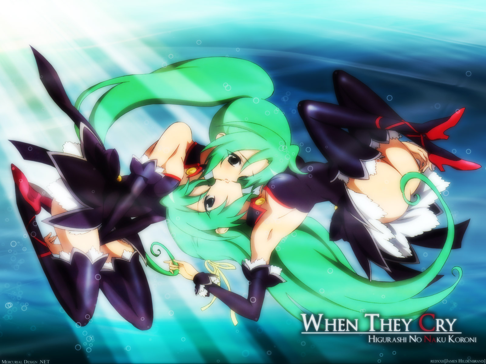 Description: A couple of anime characters floating in the water together with a caption that reads.