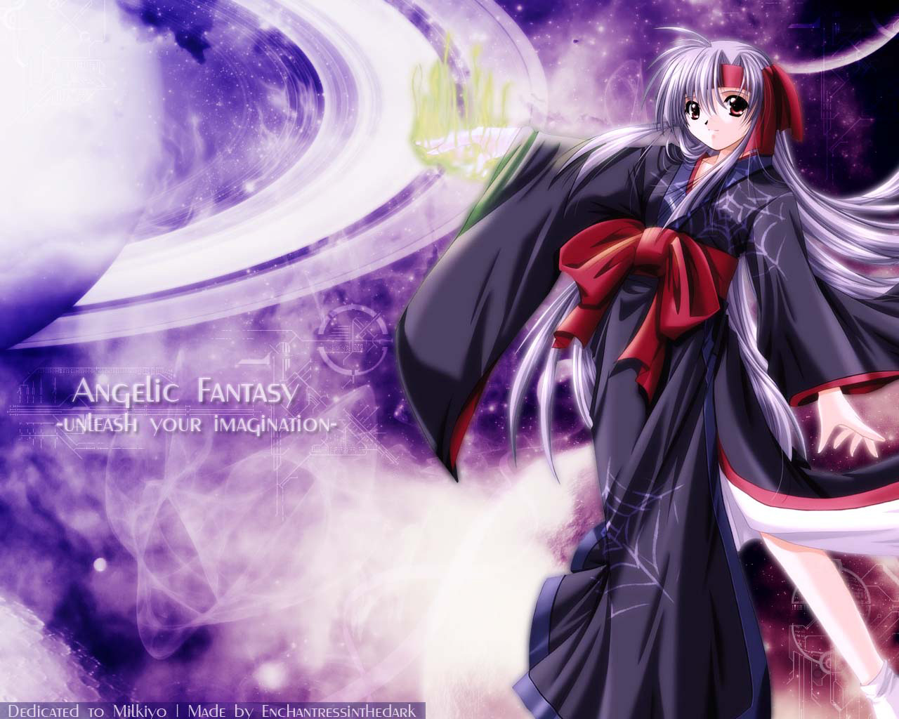 Description: A anime character with long white hair and a black dress and a red scarf on her head and a purple background.