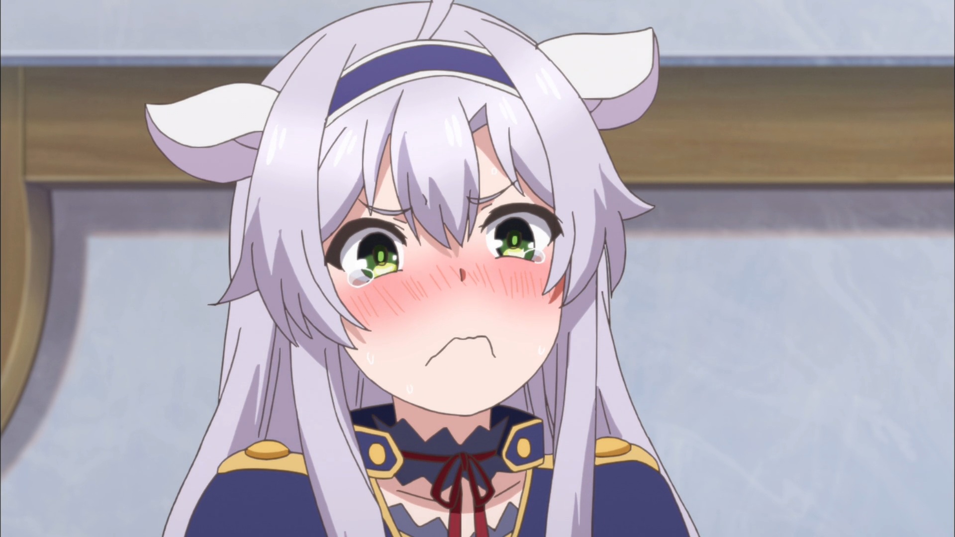 Description: A anime character with long white hair and green eyes wearing a blue outfit and a horned headband.