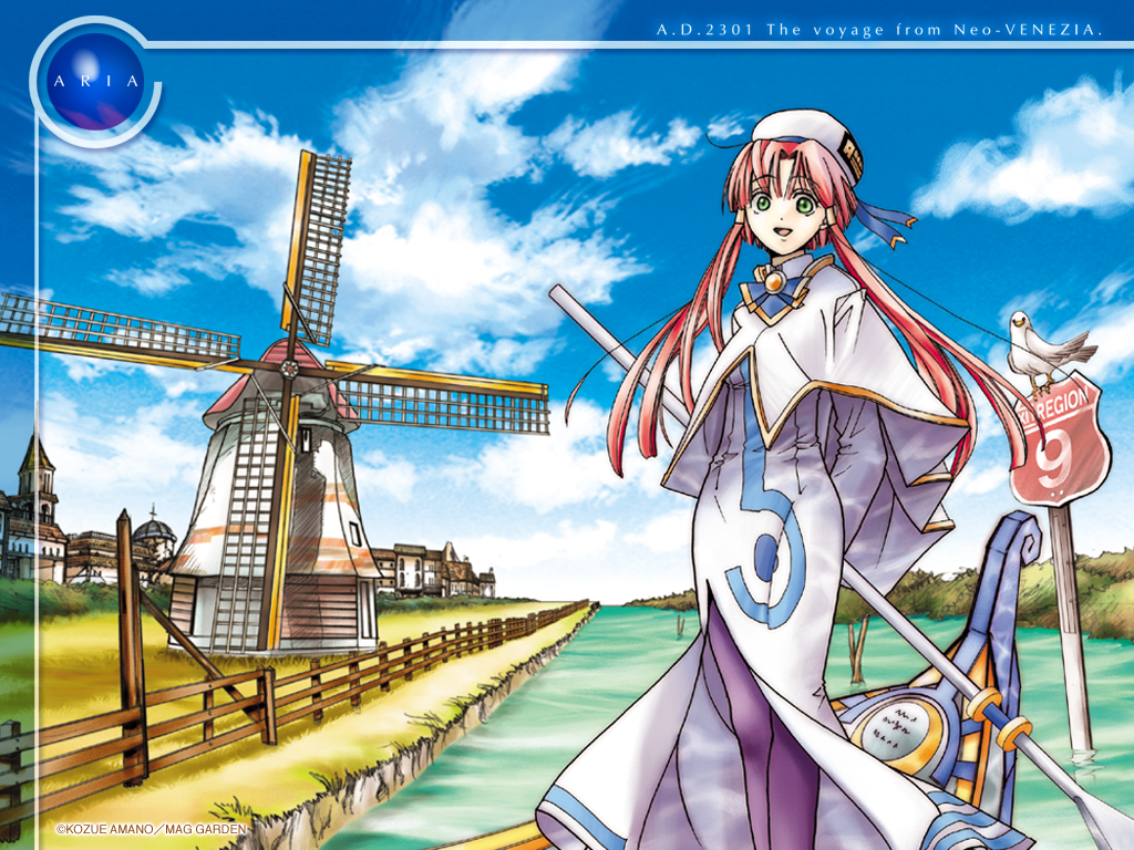 Description: A anime character is standing in front of a windmill and a windmill wheel with a bag on it's shoulder.