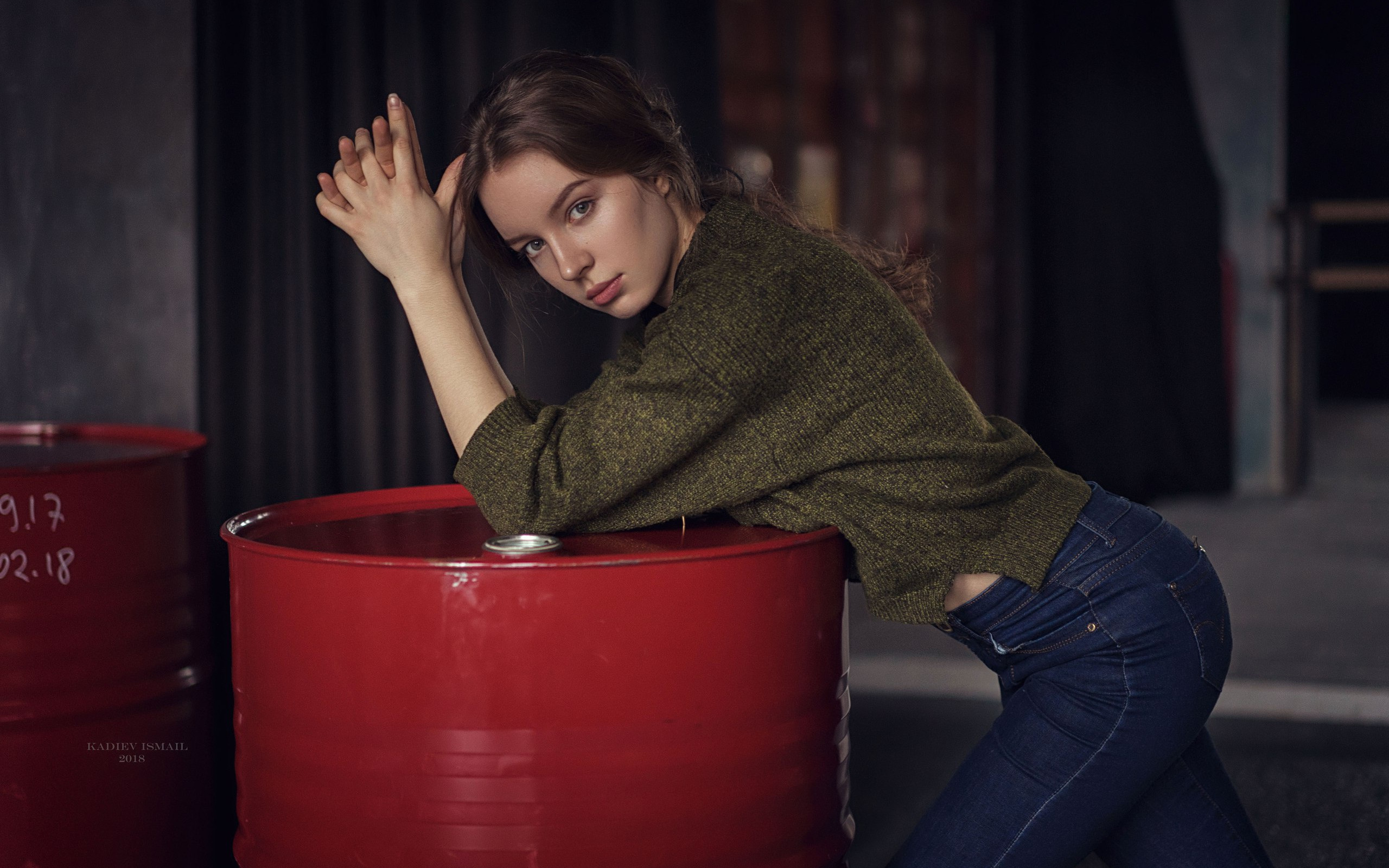 Description: A woman leaning on a barrel and leaning on the barrel with her hands on her head and her hand on her head.