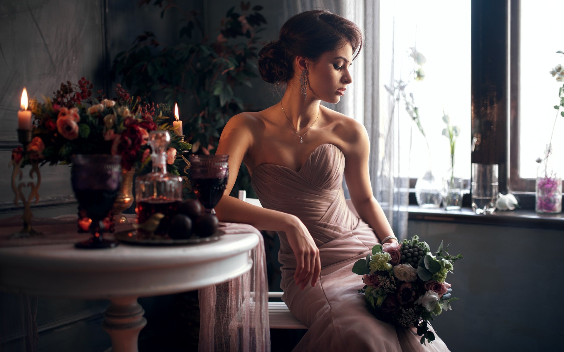 Description: A woman in a dress sitting on a chair with a bouquet of flowers in her hand and a candle in her hand.