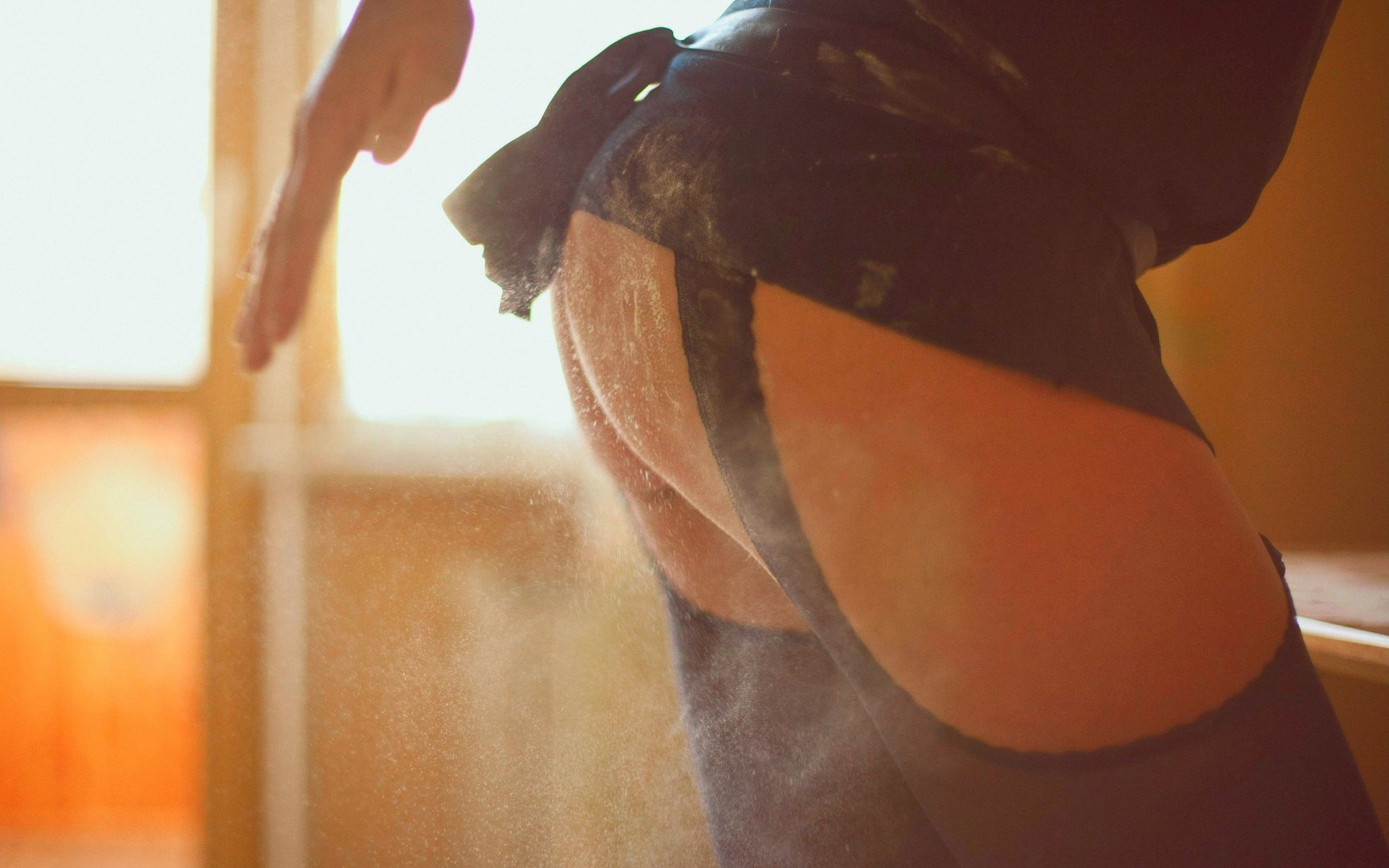 Description: A person with a black shirt and a white and black shirt and a window and a hand reaching for something.