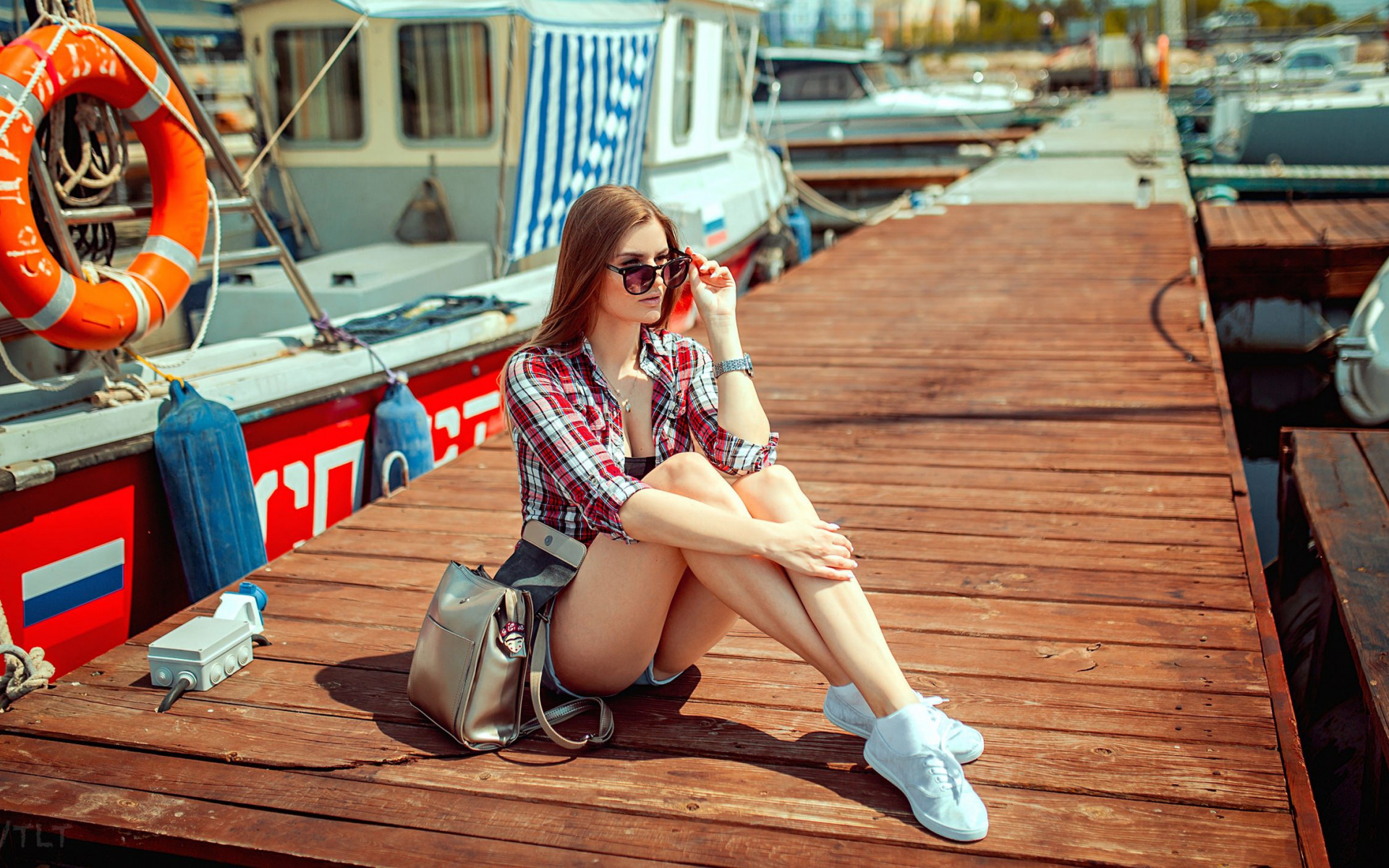 Description: A woman sitting on a dock with a purse and a purse on her lap.