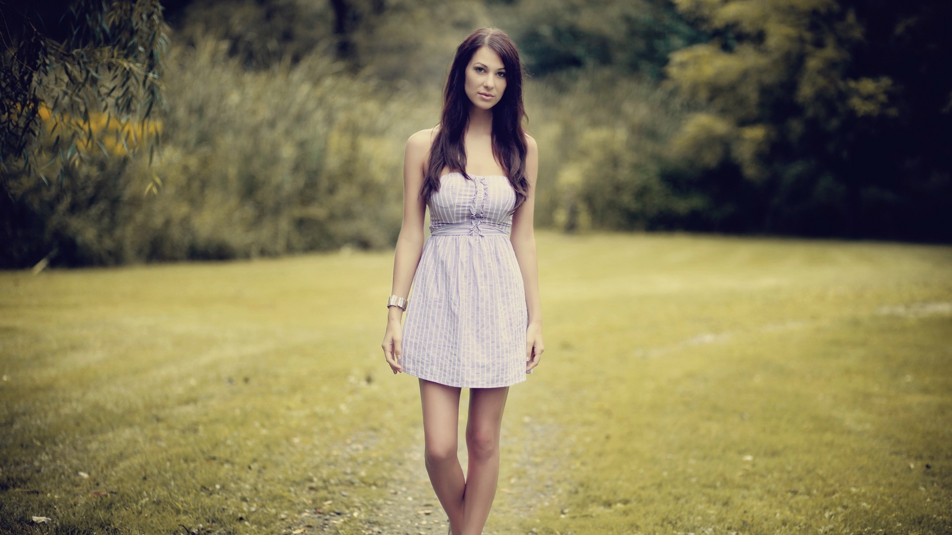 Description: A woman in a dress standing in a field of grass with trees in the background and a path leading to the grass.