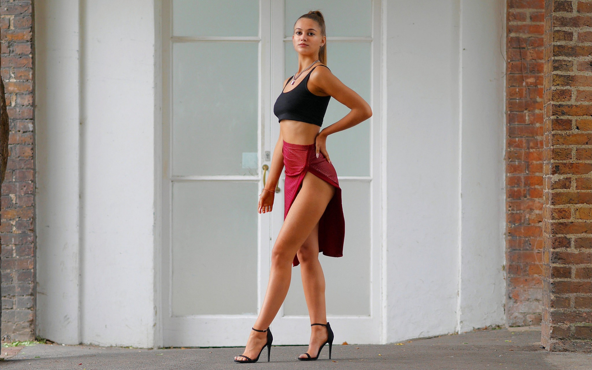 Description: A woman in a black top and red skirt standing in front of a door with her legs crossed and her hand on her hip.