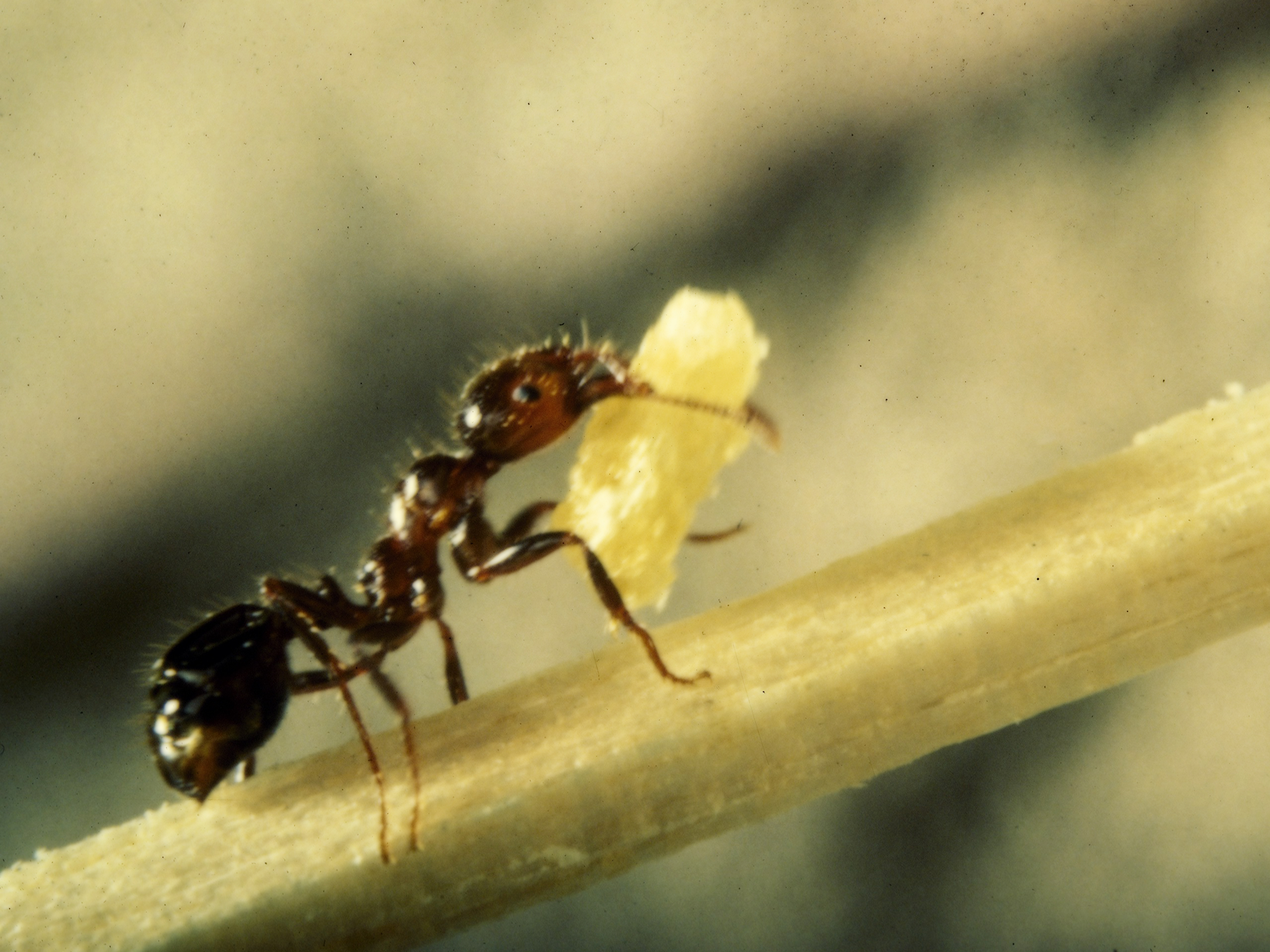 Description: A ant antler is eating a piece of fruit on a stick in the sunlight.