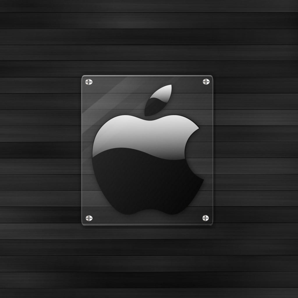 Description: A black and white apple logo on a black background with a wooden textured wall behind it and a black and white apple logo.