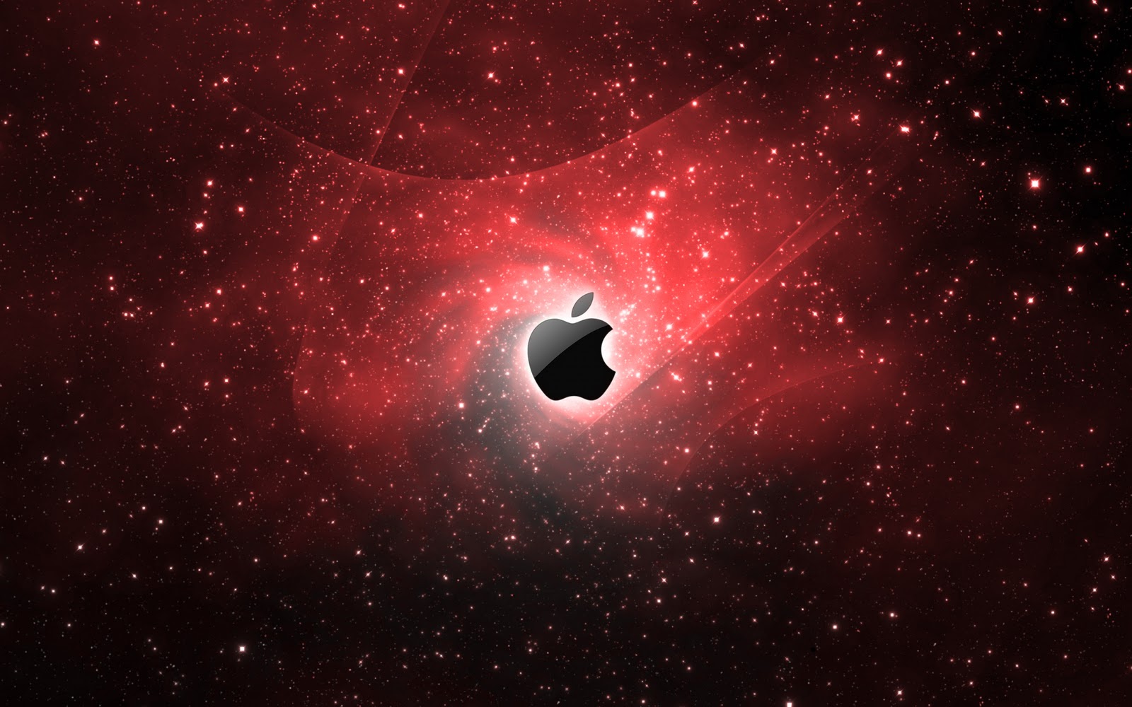 Description: An apple logo is shown in the middle of a space filled with stars and a red light in the middle.
