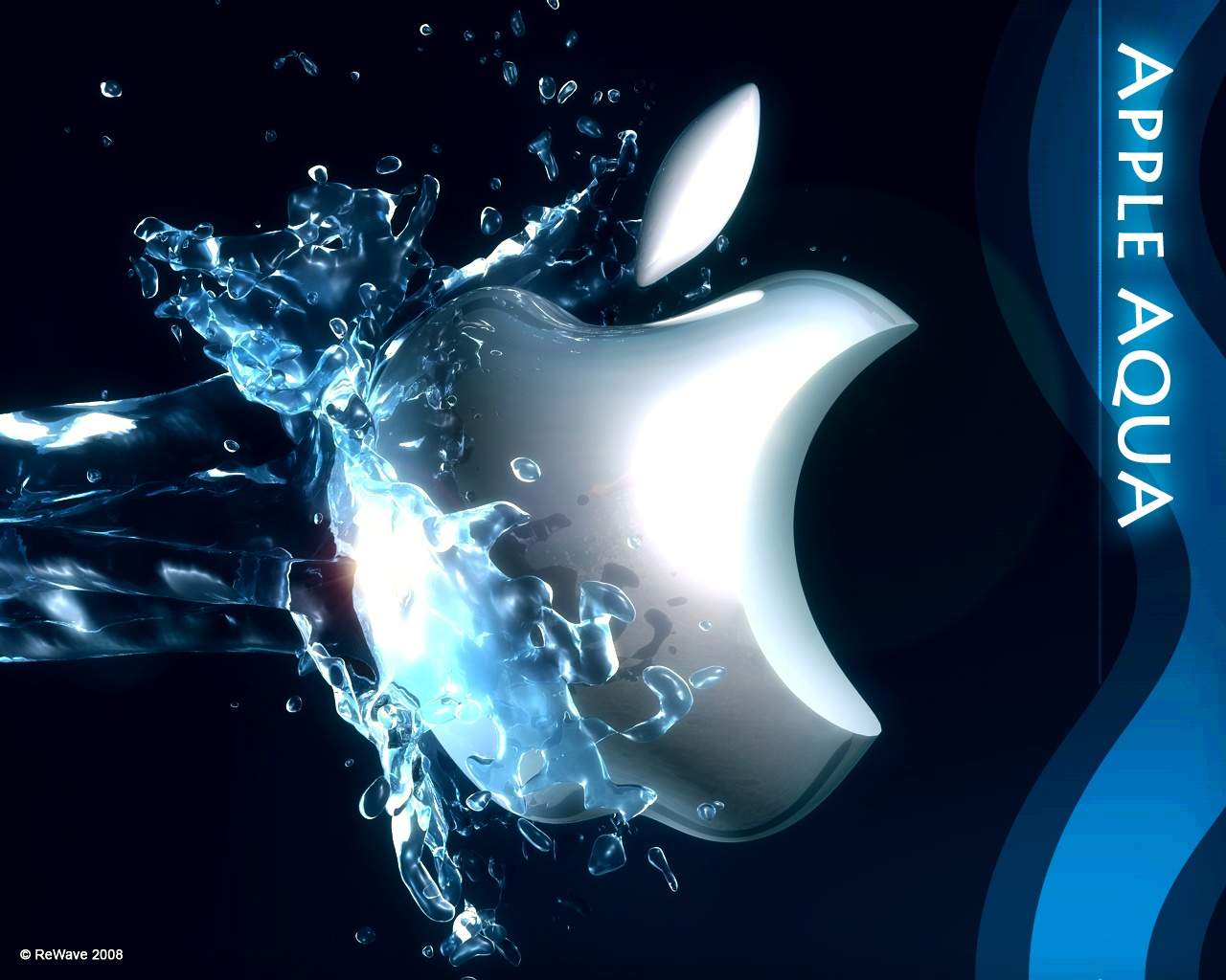 Description: An apple logo is shown with water splashing around it and the apple logo is blue and white with a splash of water on it.