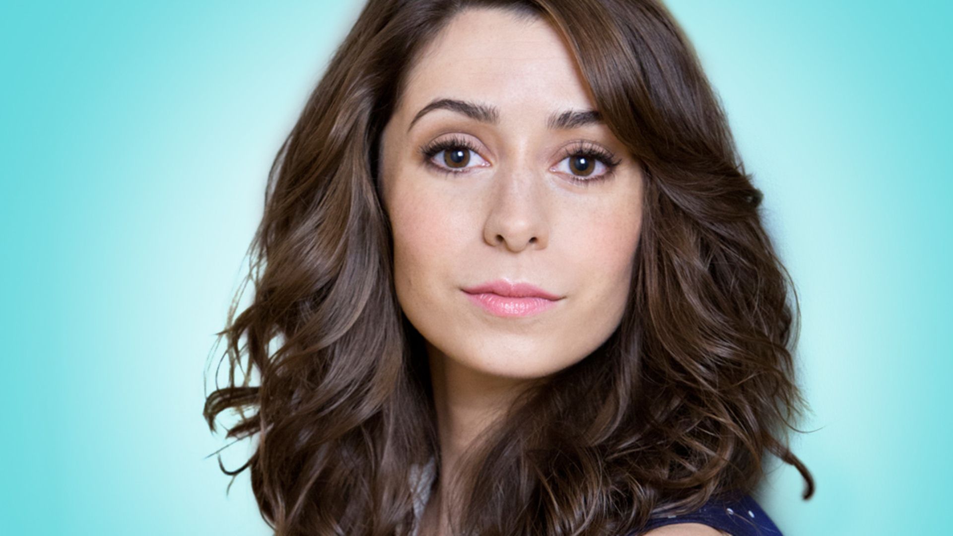 Description: A woman with long hair and a blue shirt is posing for a picture with a blue background and a blue background.