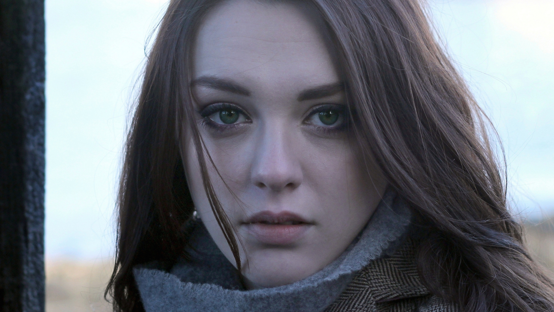 Description: A woman with long hair and green eyes wearing a scarf around her neck and a coat over her shoulders.