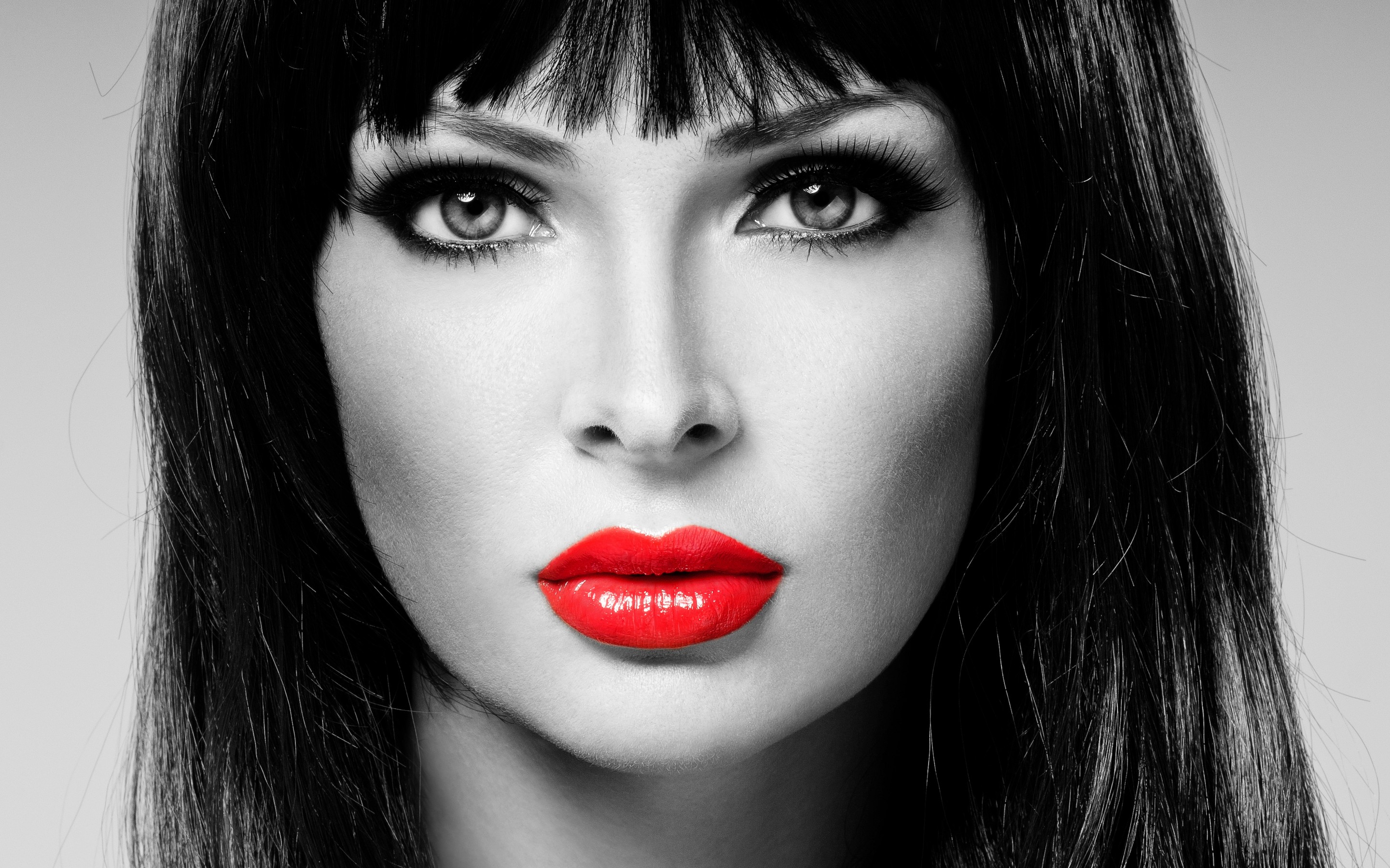 Description: A woman with red lipstick on her lips and a black wig with bangs and bangs on her head and a black and white background.