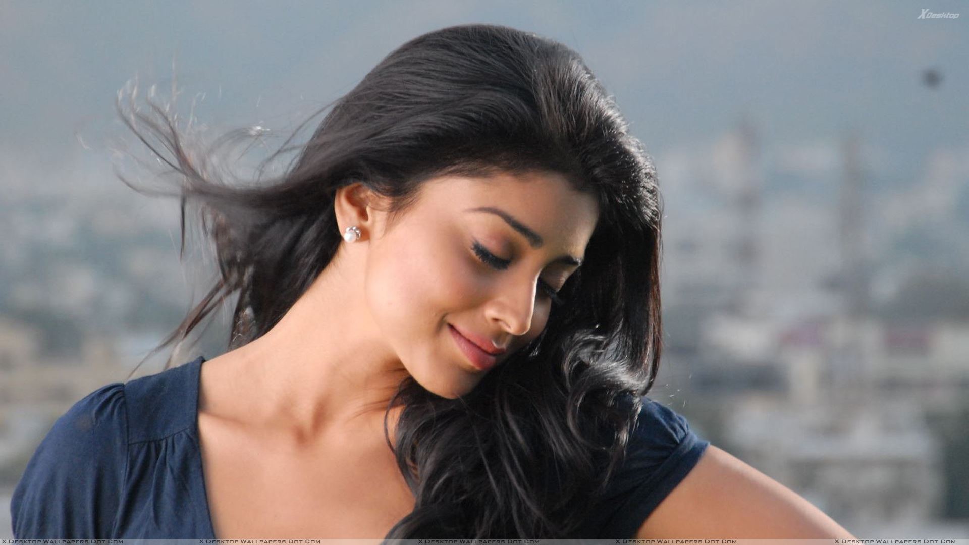 Description: A woman with long hair and a blue shirt is looking down at her cell phone and smiling at the camera.