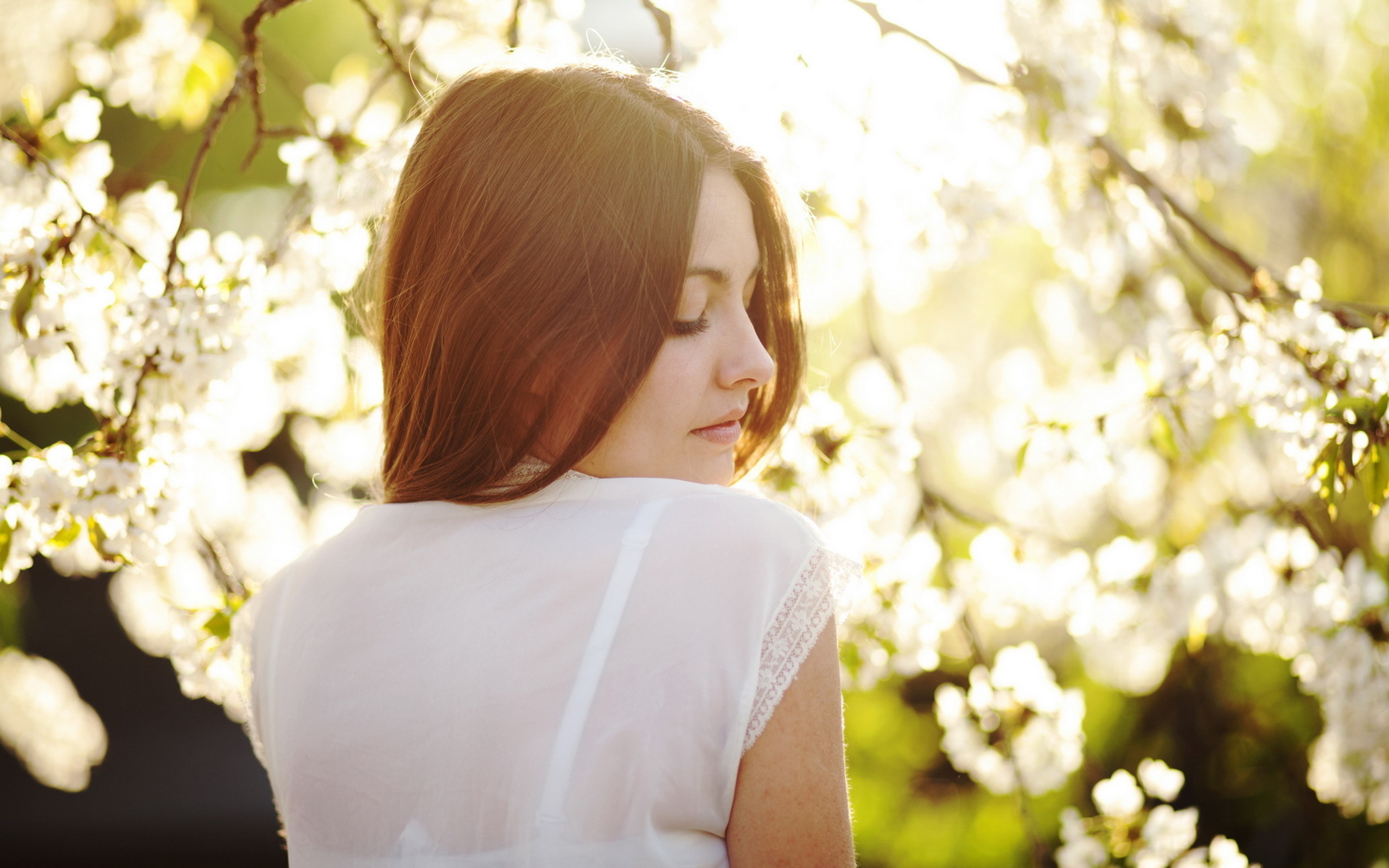 Description: A woman standing in front of a tree with white flowers on it's branches and a sun shining through the leaves.