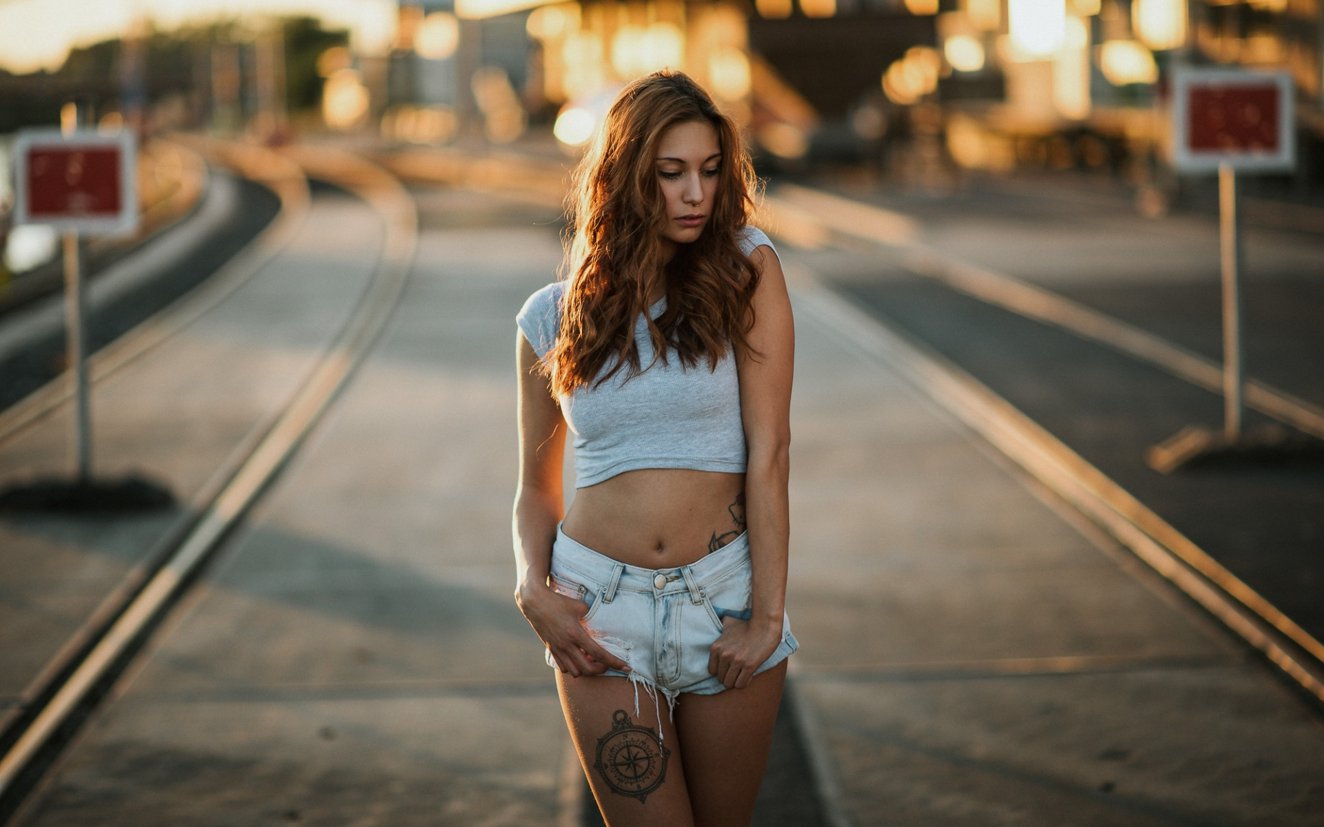 Description: A woman standing on a train track with her hands in her pockets and her shirt off.